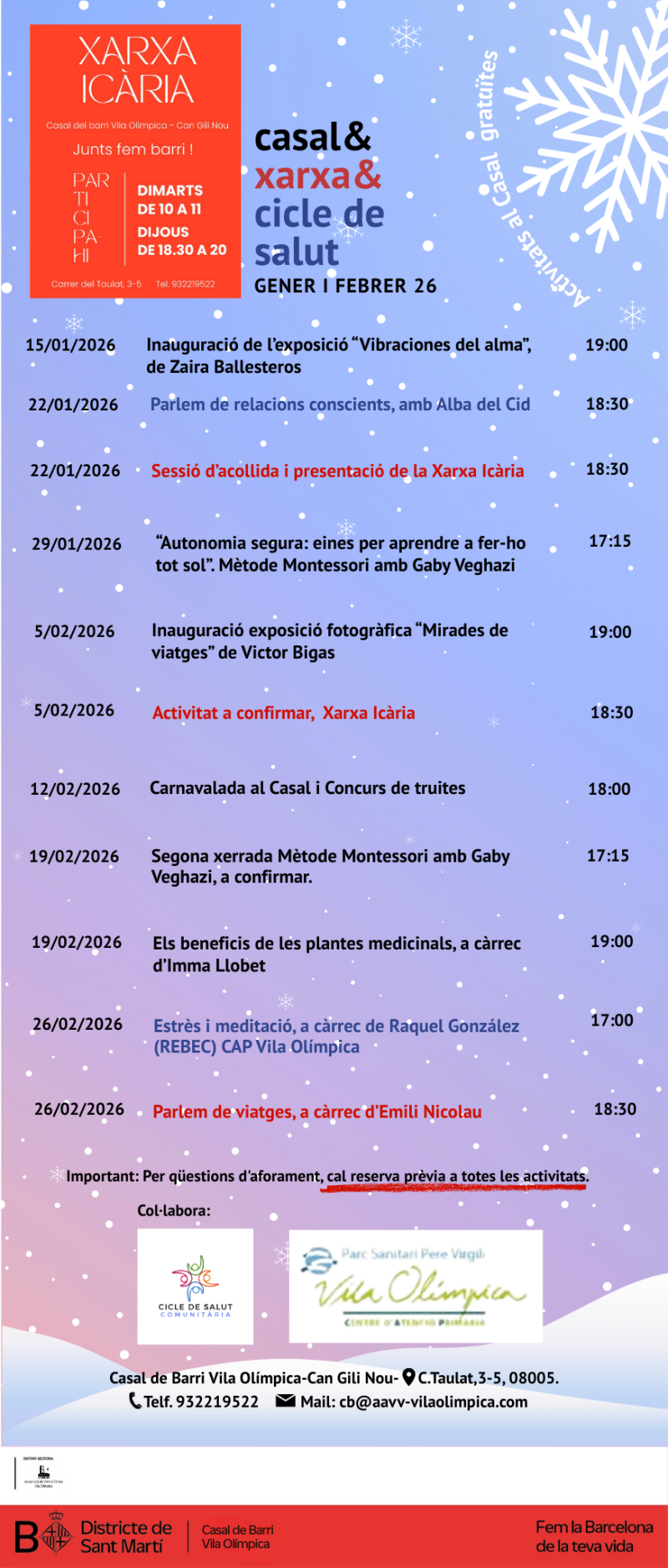 Activitat gratuïta, per inscriure's a cb@aavv-vilaolimpica.com
